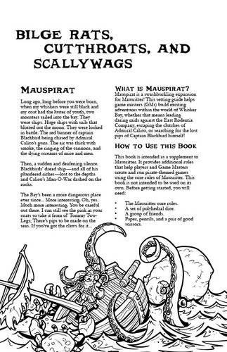 Mauspirat is a swashbuckling expansion for Mausritter! This setting guide helps game masters (GMs) build exciting adventures within the world of Whisker Bay, whether that means leading daring raids against the East Rodentia Company, escaping the clutches of Admiral Calico, or searching for the lost pips of Captain Blackbird himself!